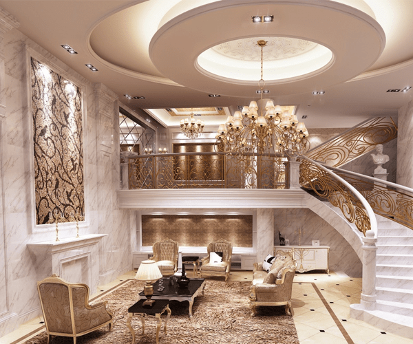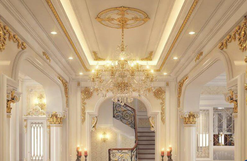Trần thạch cao phong cách tân cổ điển đặc trưng với họa tiết phức tạp trên trần nhà