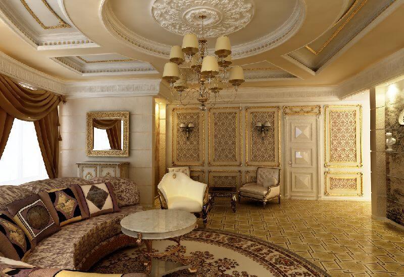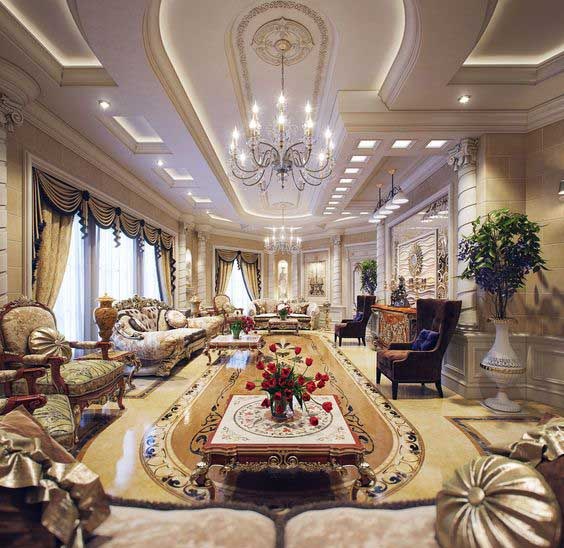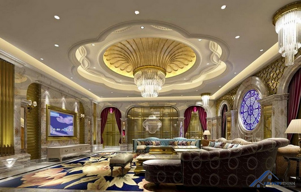 Trong phong cách cổ điển, trần thạch cao phòng khách sẽ trang trí thêm những đường nét hoa văn và được sắp xếp đảm bảo theo một tỉ lệ nhất định. Tạo nên sự hài hòa với nội thất cổ điển của căn phòng, tăng vẻ sang trọng cho ngôi nhà.