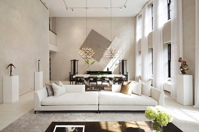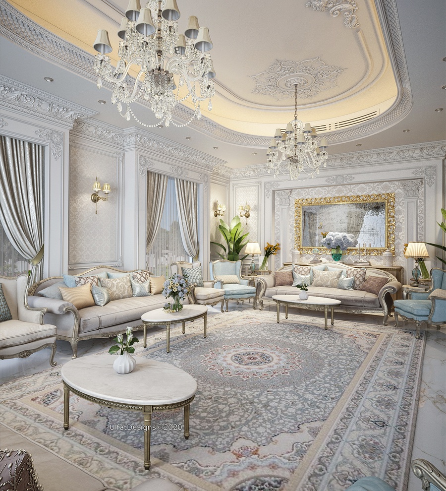 Trần thạch cao phòng khách tân cổ điển là sự lựa chọn hàng đầu cho những căn biệt thự sang trọng. Sự kết hợp giữa màu trắng và kem từ nội thất, đèn trần, sơn nhà đến trần nhà sẽ tôn thêm vẻ sang trọng cho không gian và còn tránh gây chói mắt người nhìn.