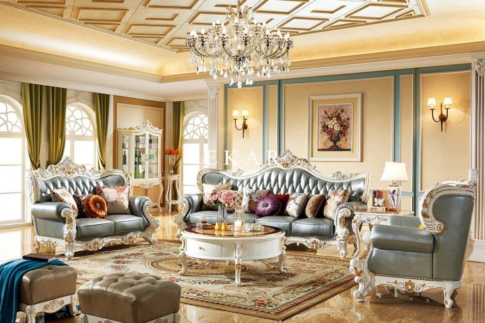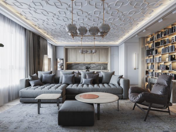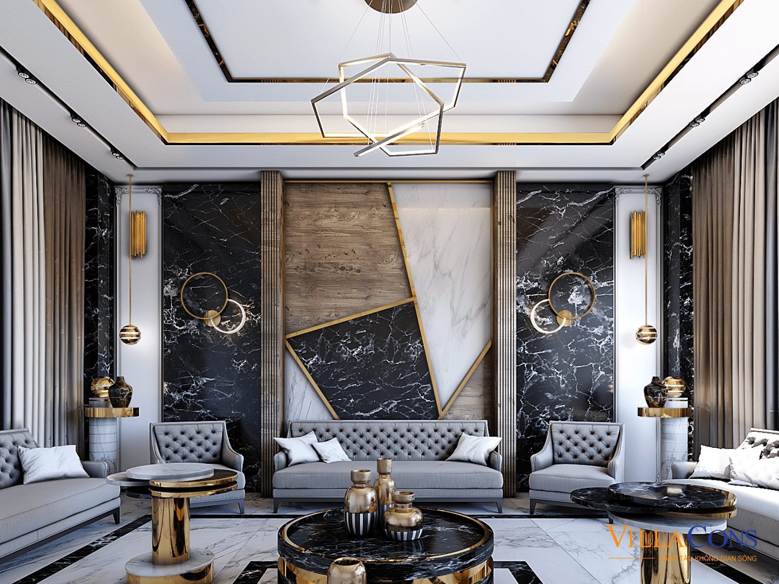 Những họa tiết trên trần nhà kết hợp hài hòa với nội thất phòng khách