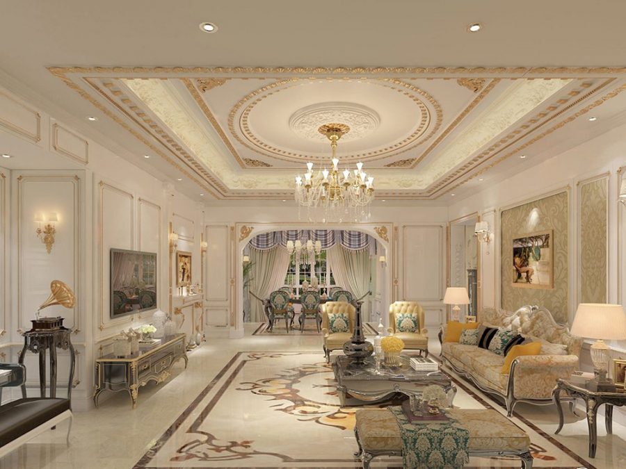 Thiết kế trần nhà phòng khách theo phong cách tân cổ điển là một trong những trào lưu rất được ưa thích hiện nay.